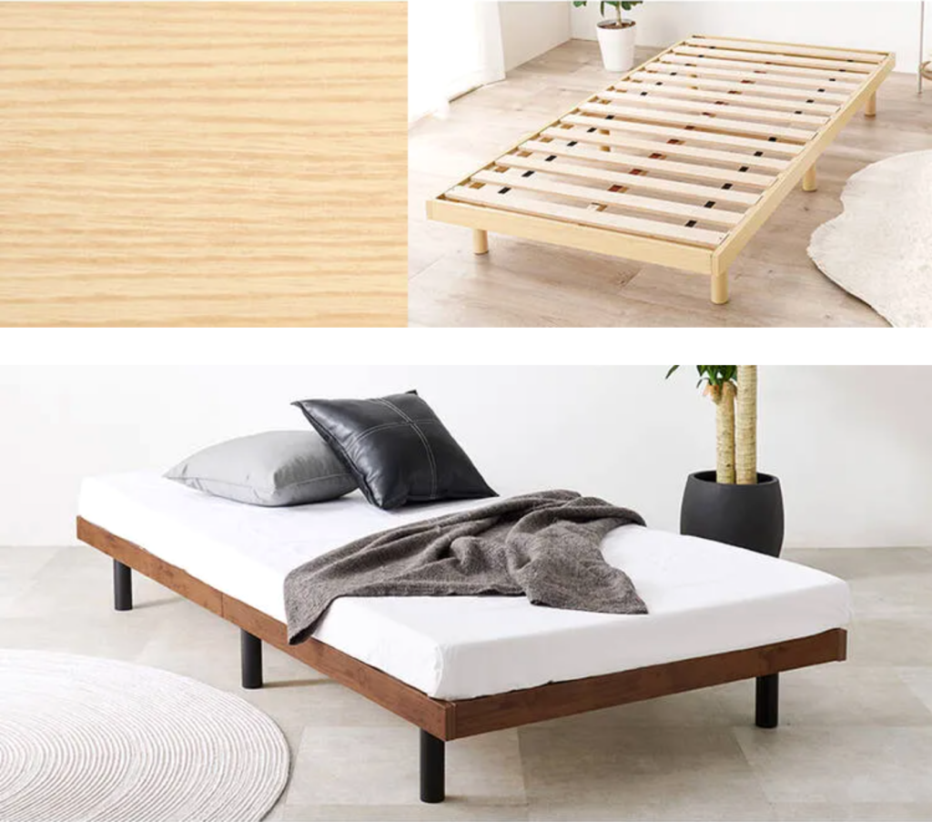 ベッドフレームは、**ナチュラル系(ライトブラウン/ホワイトオーク/ミルク色)**を基準にすると失敗しません。