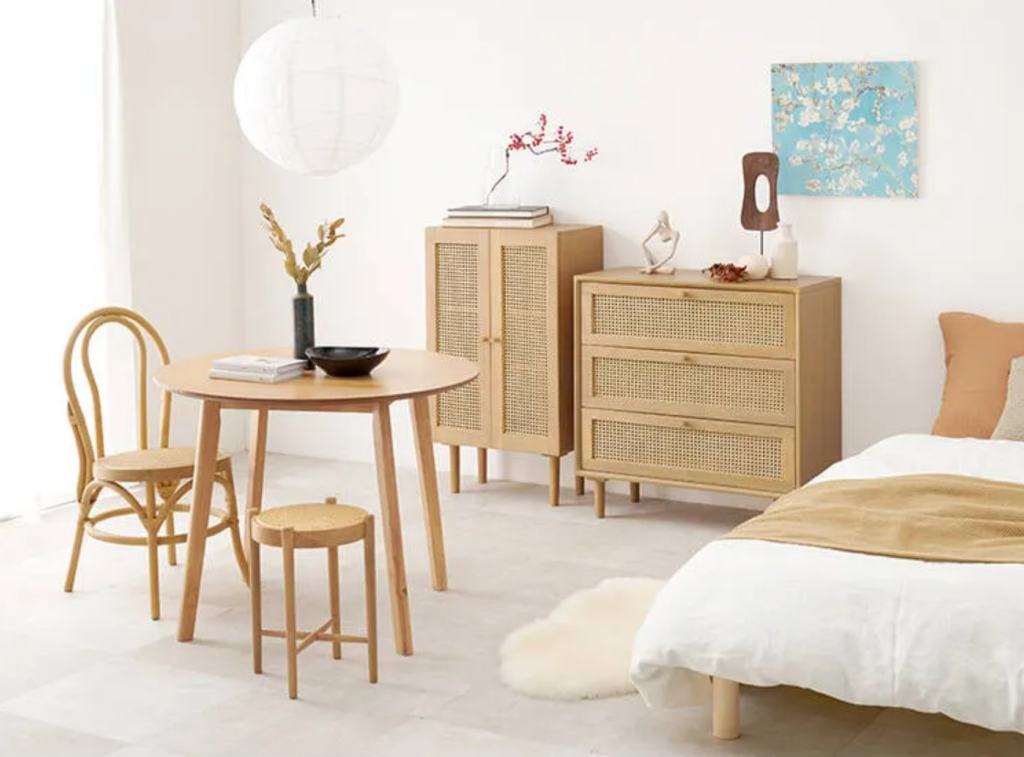 家具の色や素材を揃えると、統一感が出てスッキリ見えます。木目×ホワイトのナチュラルカラーや、ブラック×ウォルナットのモダンスタイルなど、好みに合わせてトーンを合わせましょう。
