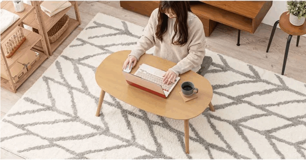 こたつの天板や脚部をオーク材やウォールナット調にすると、ナチュラルで落ち着いた空間に。さらに、ラグやこたつ布団をコットンやリネンなどのファブリック素材で揃えることで、自然素材の温もりが引き立ちます。